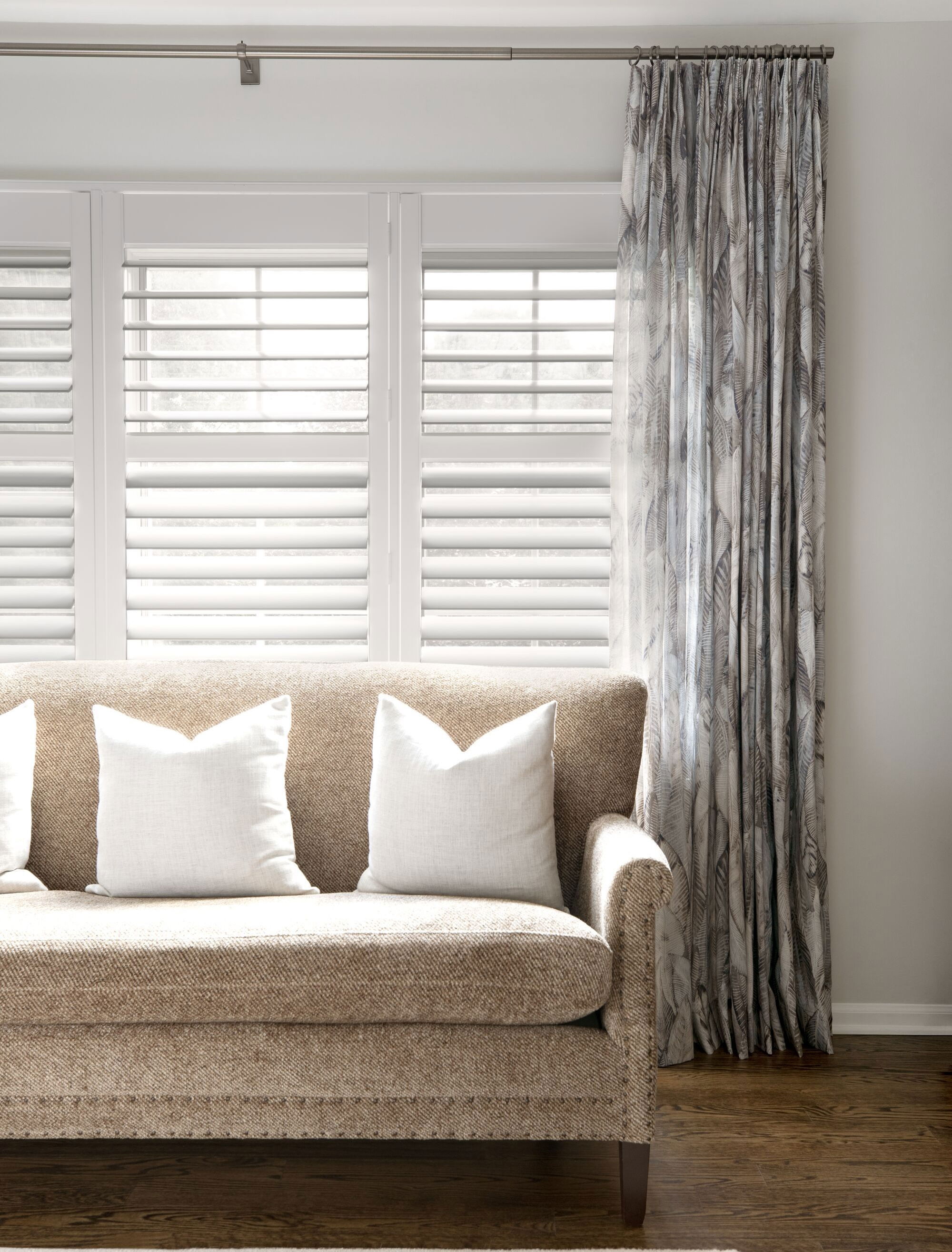 Combinez des panneaux pleine longueur, du sol au plafond, à une palette ton sur ton pour accompagner vos toiles de fenêtre ou vos stores en similibois. Vous gagnerez en flexibilité au fil de la journée et maîtriserez la lumière qui entre dans votre espace. Une fois le soir venu, fermez simplement les rideaux pour une ambiance complètement intime.