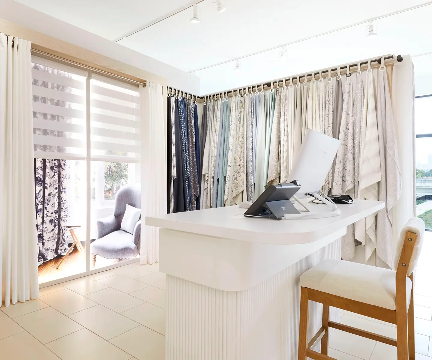 Des habillages de fenêtre en tissu qui montent et descendent pour un contrôle simple et épuré de la lumière.